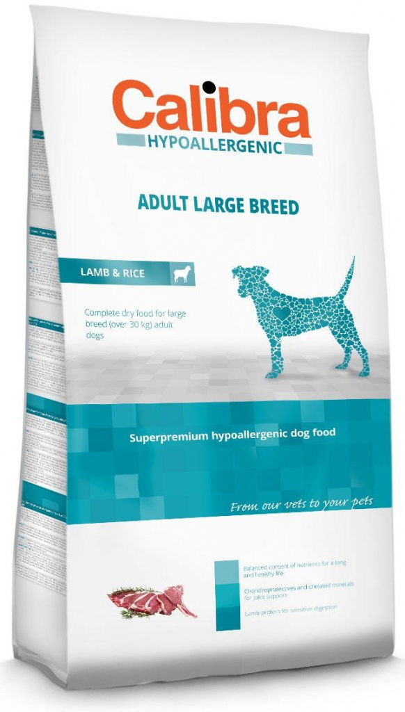 Krmivo Calibra Adult Large Breed / Lamb & Rice sú hypoalergénne granuly pre dospelých psov veľkých a obrích plemien s váhou nad 30 kg. Veľkosť granúl je prispôsobená potrebám veľkých plemien. Receptúra s jahňacím mäsom a s nízkym obsahom obilnín je vysoko stráviteľná, tak aby vyhovovalo aj veľmi citlivému zažívania. Obsah bielkovín plne rešpektuje požiadavky pre veľké plemená psov a obsah chondroprotektív pomáha chrániť kĺbovej chrupavky.